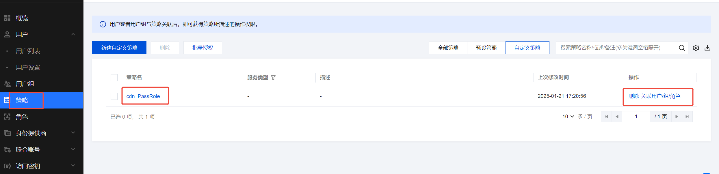 在左侧目录中选择策略,进入策略页面后,可以看到刚创建的 cdn_PassRole 策略,或者通过搜索名称找到该策略,单击右侧操作列的关联用户/组/角色,在弹出窗口中,选择需要关联的子账号/协作者,完成关联操作。