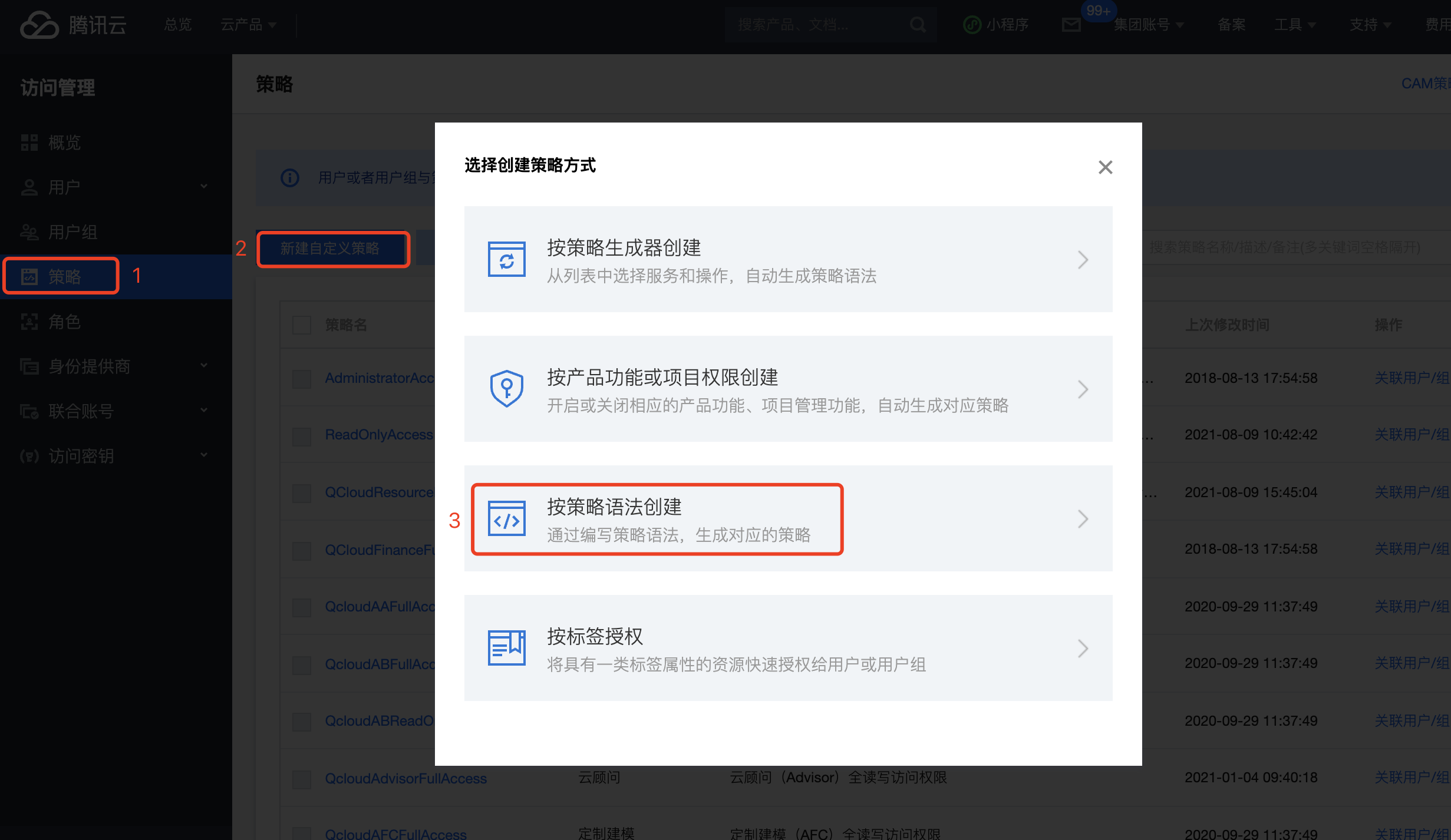 2.1 主账号或具有管理权限的子账号/协作者进入访问管理控制台,选择左侧目录的策略,然后选择 新建自定义策略,在弹出的对话框中,选择按策略语法创建。