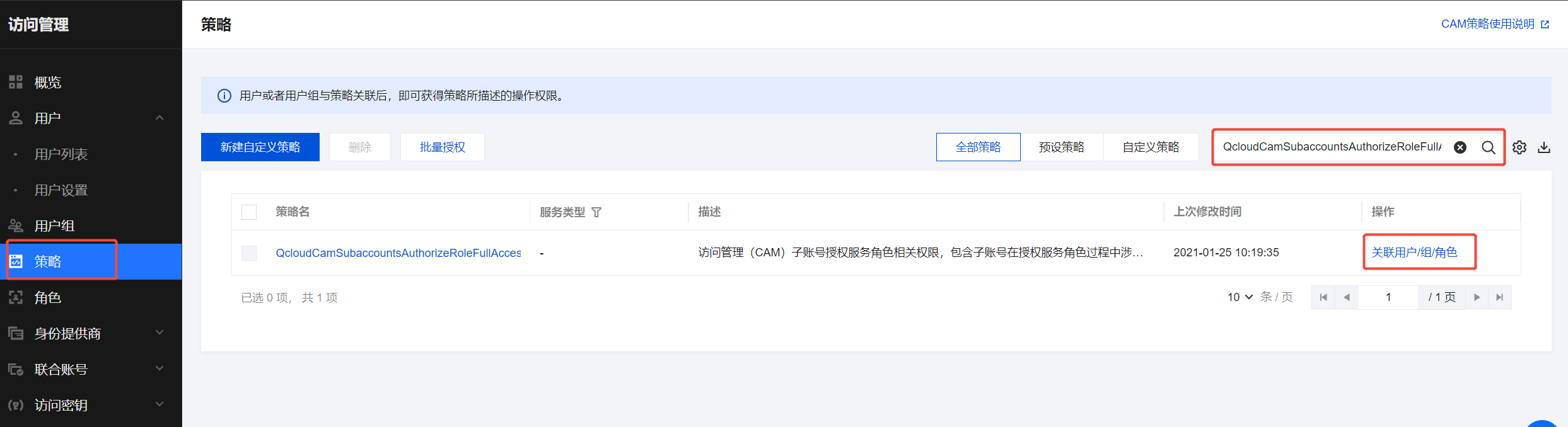 1. 预设策略 QcloudCamSubaccountsAuthorizeRoleFullAccess。