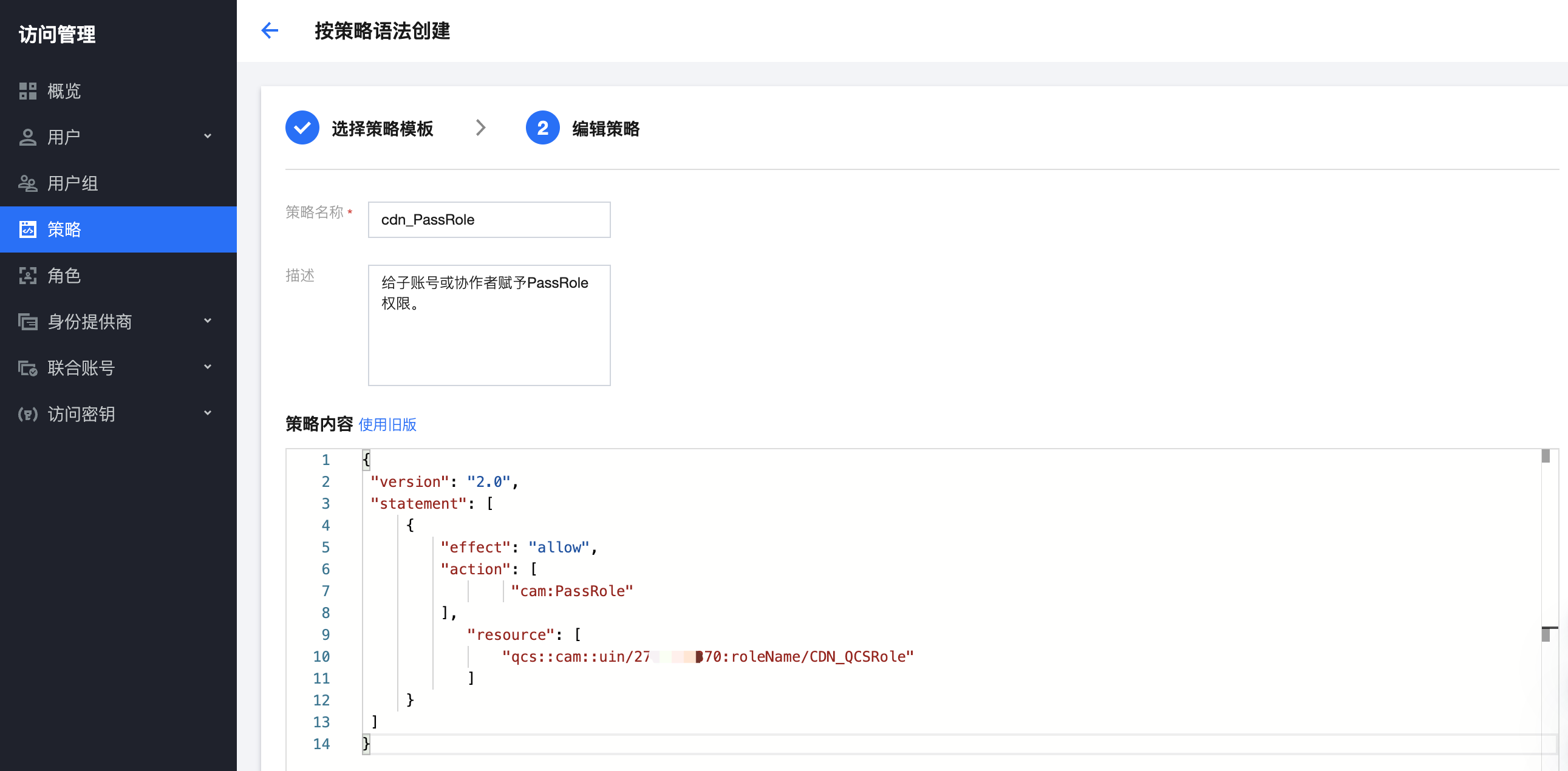 2. 创建自定义策略 cdn_PassRole,并关联到子账号/协作者。