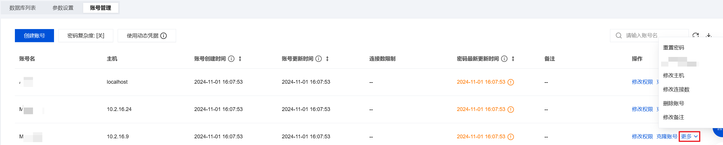 2. 在实例管理页面,选择数据库管理 > 账号管理页,找到需要重置密码的账号,单击重置密码或选择更多 > 重置密码。