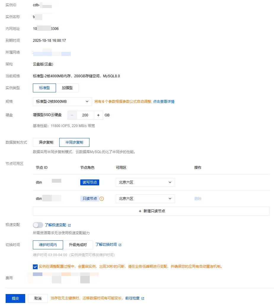 节点可用区 | 可在此项增加、删除只读节点,更换节点可用区(具体以实际资源情况为准)。 |