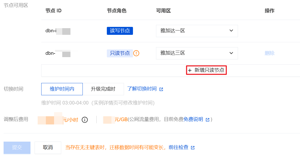 3. 在调整配置页面,节点可用区下面,单击新增只读节点,然后设置此只读节点的可用区。