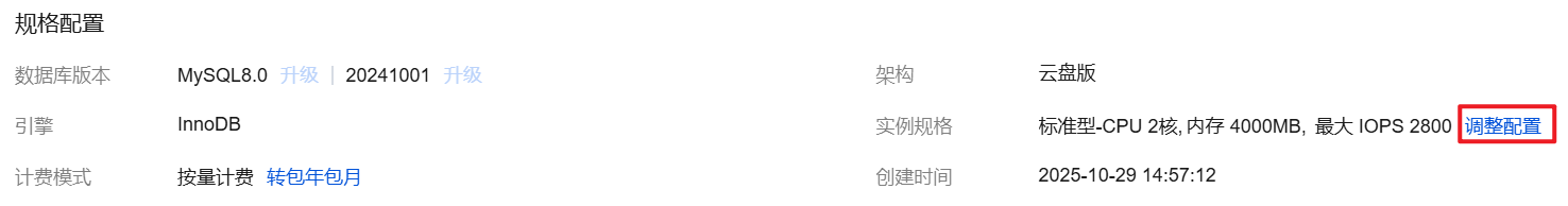 2. 在实例详情 > 规格配置 > 实例规格后,选择调整配置。