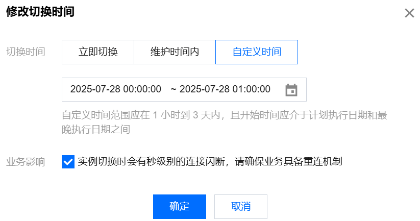切换时间 | 选择要修改的切换时间,支持选项及说明如下。 立即切换:选择立即切换,表示单击确定后,该运维事件立即执行切换。请注意,对于任务状态已在执行中,切换时间选择为立即切换的任务,将无法修改为其他切换时间类型。 维护时间内:选择维护时间内,表示该运维事件会在涉及实例的下一个维护时间内执行切换,您可以在该实例的详情页查看或修改维护时间,操作请参见 设置实例维护时间。 自定义时间:选择自定义时间,您可以在时间框内选择预期的时间范围(精确到秒),设置完成后,该运维事件会在您设置的时间段内执行切换。 说明: 自定义时间范围应在1小时到3天内,且开始时间应介于计划执行日期和最晚执行日期之间。 |