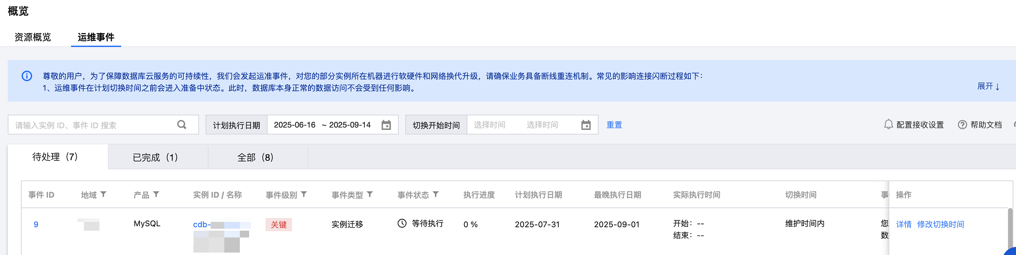 查看当前腾讯云账号关于云数据库 MySQL 实例的未处理的运维事件信息。