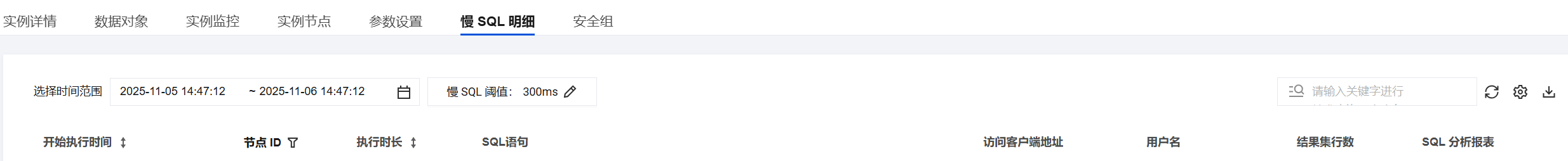 在慢日志明细列表下,默认展示当天所产生的所有慢 SQL 信息。慢日志最大保存30天。