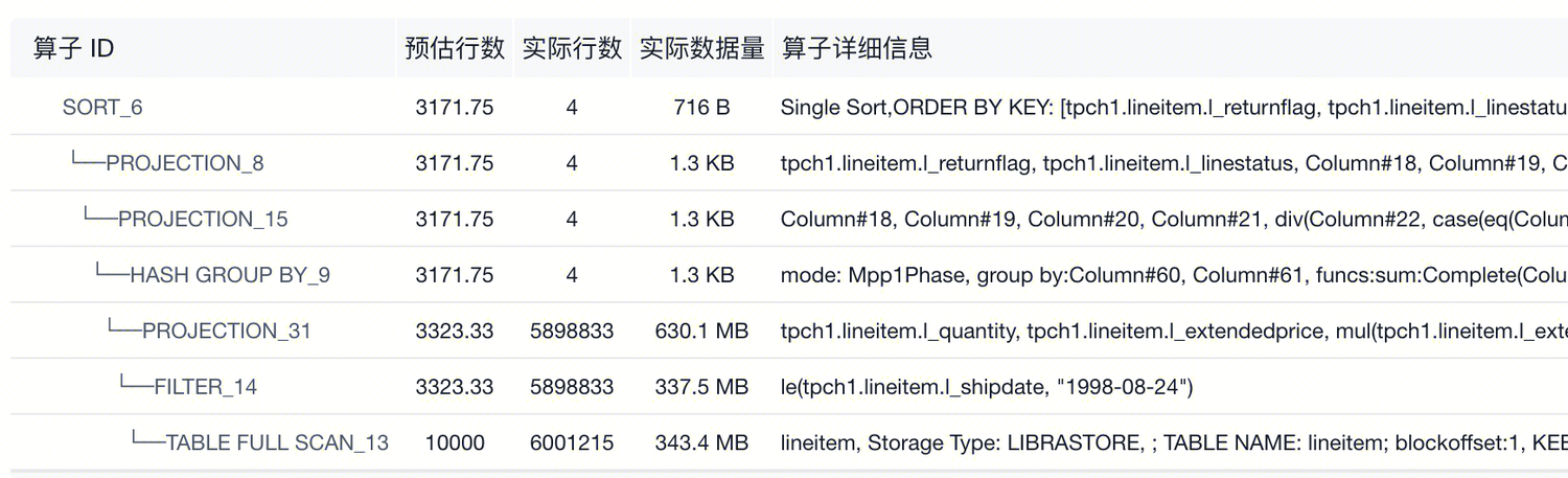预估行数:算子预估行数是优化器在制定执行计划时的重要参考。基于表统计信息和索引情况,优化器会预测每个算子可能输出的数据行数。需要注意的是,由于数据分布的复杂性,这个预估值有时会与实际结果存在差异。