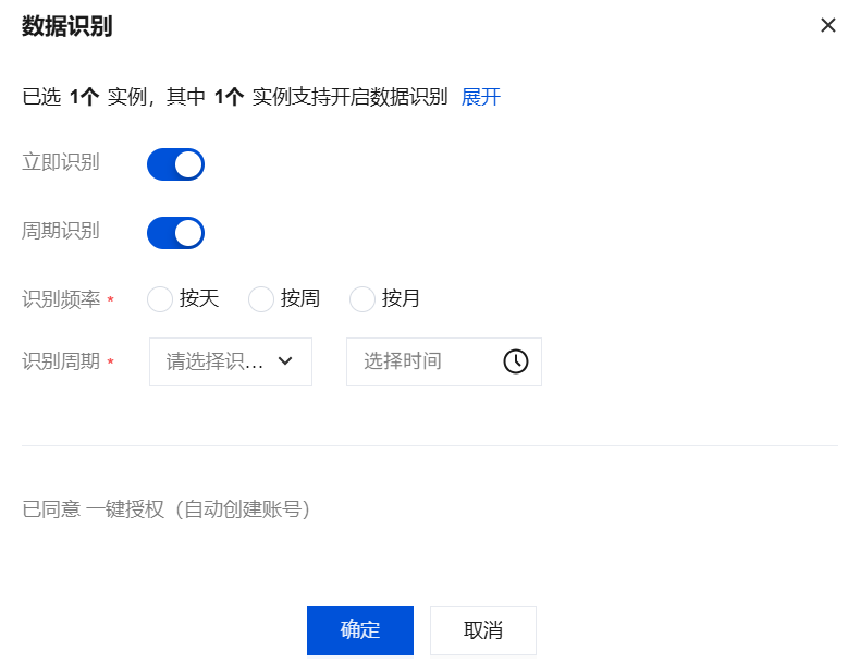立即识别 | 打开立即识别按钮,表示单击确定后,将立即对所选实例进行数据识别。当关闭立即识别按钮时,需要打开周期识别按钮并进行设置,否则将无法开启数据识别。 |