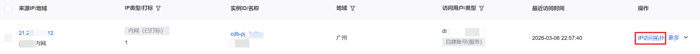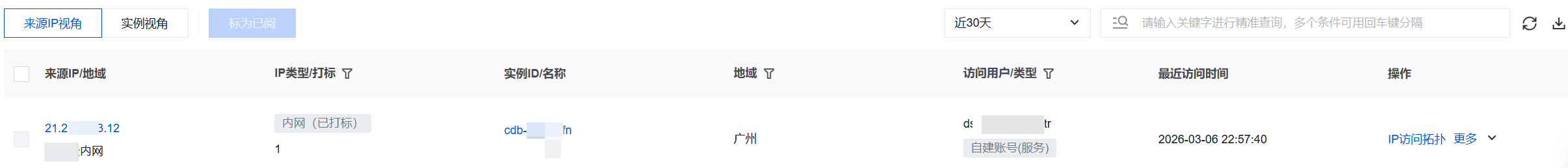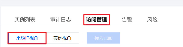 来源 IP 视角 | 以访问发起端的来源 IP 为核心管控维度,整合该 IP 对数据库实例的访问数据,提供访问拓扑可视化、IP/账号精准打标及安全组策略快速调整能力,实现对访问发起端的集中精细化管控。 | 排查单一 IP 的跨实例访问风险、批量标记某类访问端。 |