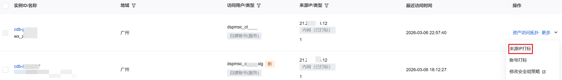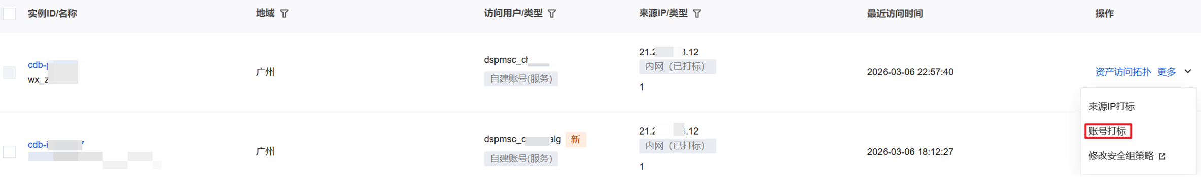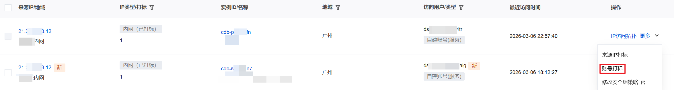 为目标来源 IP 访问数据库时使用的账号添加预设或自定义标签,实现对访问账号的分类管控,便于后续审计和风险排查。