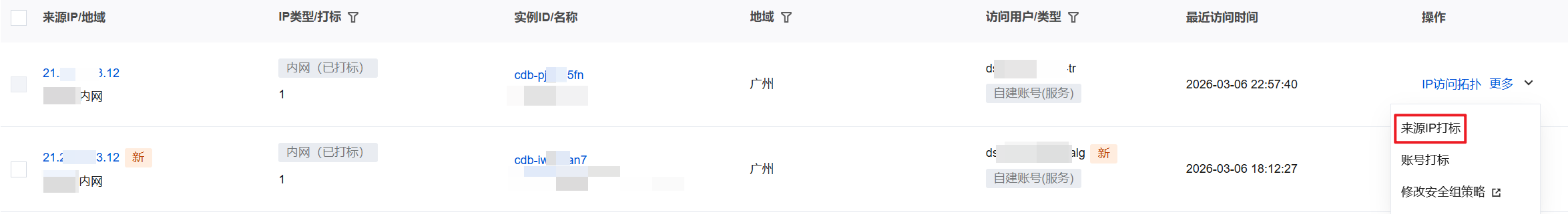 1. 在实例视角标签页面下,单击目标实例对应操作列的更多 > 来源 IP 打标。