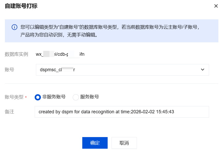 2. 在弹窗中,选择账号类型,编辑备注信息,单击确定完成标记。