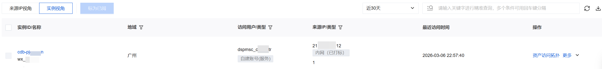 4. 在实例视角标签页面,您可以查看实例 ID/名称、地域、访问用户/类型、来源 IP/类型、最近访问时间等信息。