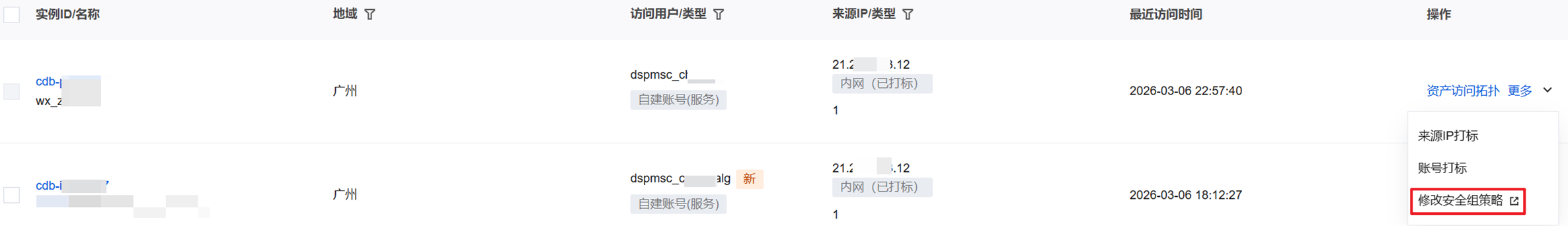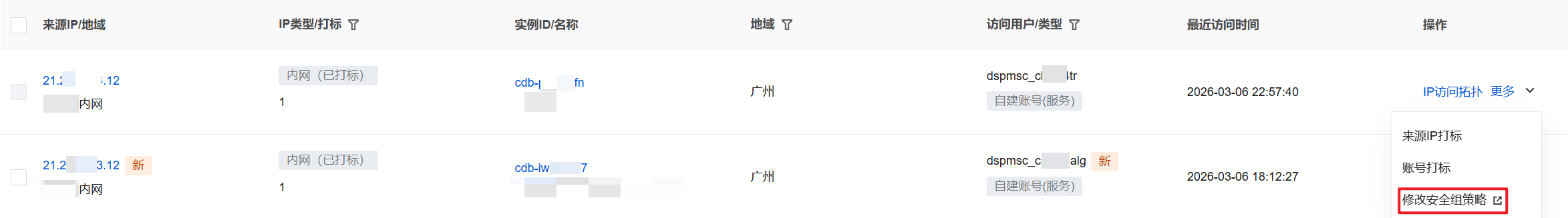在来源 IP 视角标签页面下,单击目标 IP 对应操作列的更多 > 修改安全组策略,可前往数据库实例资产页面修改安全组策略。