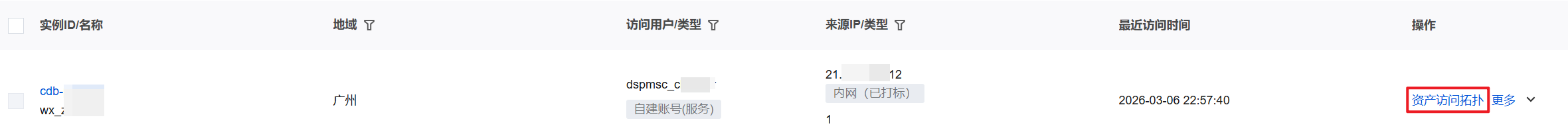 在实例视角标签页面下,单击目标实例对应操作列的资产访问拓扑,可查看该实例的所有访问来源 IP、关联账号的拓扑关系。