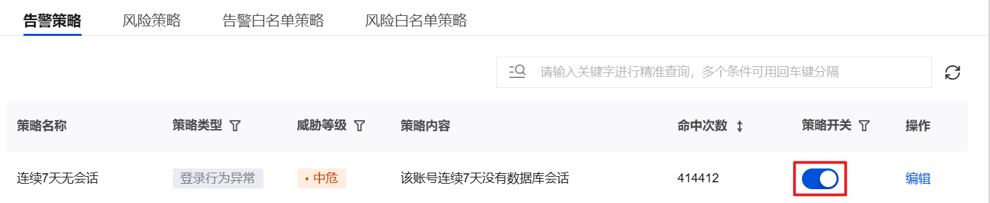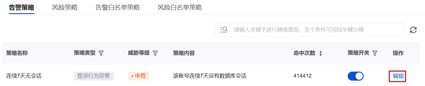 1. 在告警策略标签页面,选择目标告警策略,单击操作列的编辑。