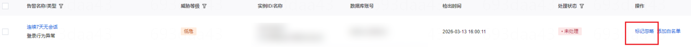 单个处理:单击目标告警操作列的更多 > 标记忽略。