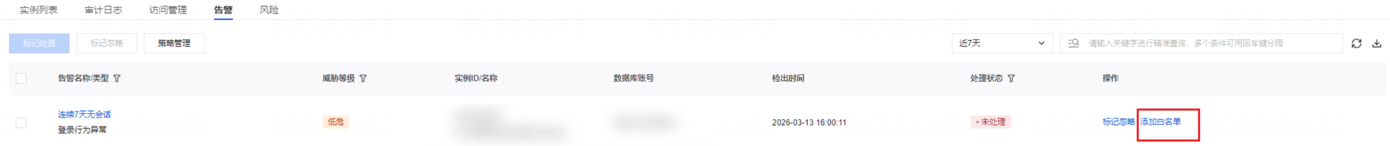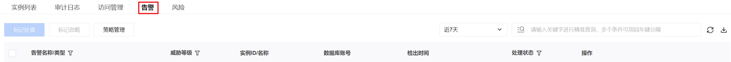 4. 在告警标签页面,您可以查看当前数据库资产的相关告警信息,包括告警名称/类型、威胁等级、实例 ID/名称、数据库账号、检出时间、处理状态。