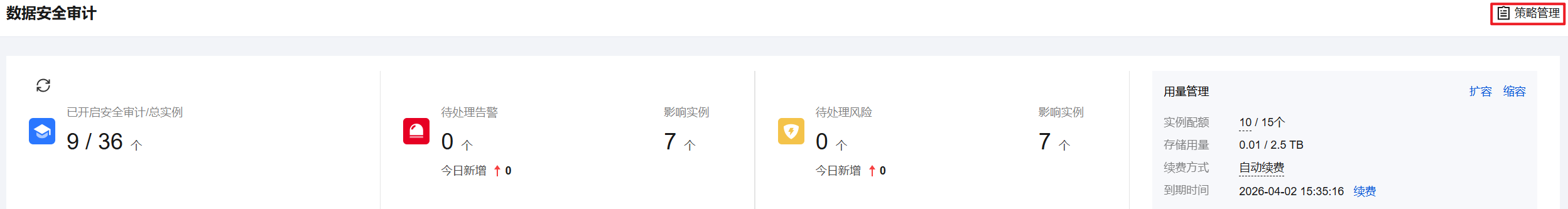 3. 在数据安全审计页面,单击右上角的策略管理。