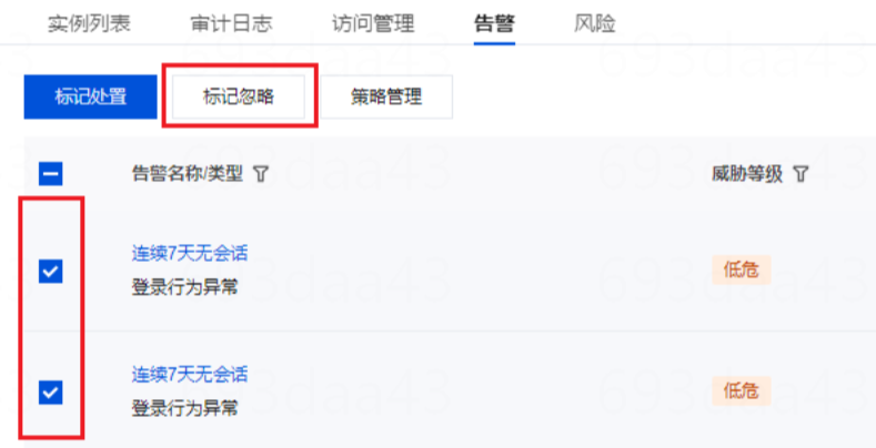 批量处理:选择多个目标告警,单击标记忽略。