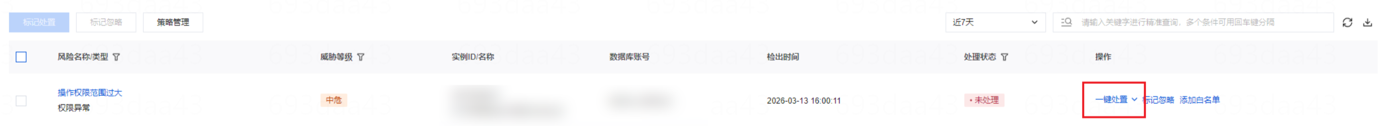 在风险标签页面,选择目标风险,单击操作列的一键处置,可通过系统预设的处置操作进行风险处置。