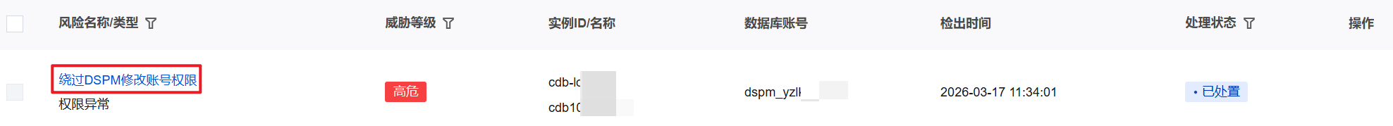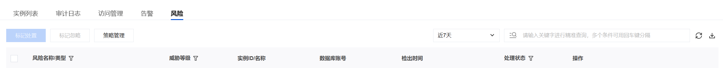 4. 在风险标签页面,您可以查询已触发风险策略的数据安全风险,包括风险名称/类型、威胁等级、资产实例 ID/名称、数据库账号、检出时间、处理状态等信息。