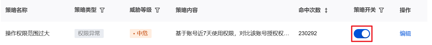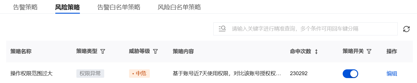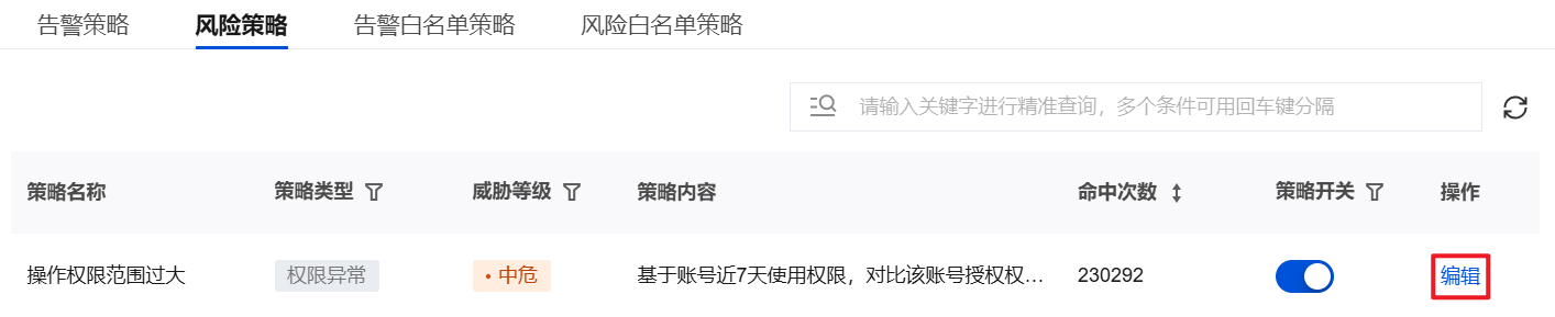 1. 在风险策略标签页面,找到目标风险策略,单击操作列中的编辑。