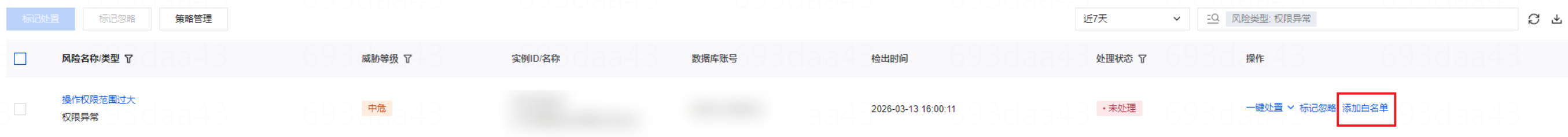 1. 在风险标签页面,单击风险名称为操作权限范围过大的风险操作列中的添加白名单。