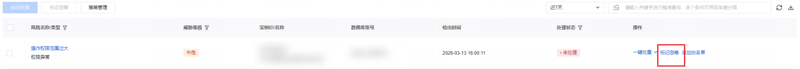 单个处理:单击风险名称为操作权限范围过大的风险操作列中的标记忽略。