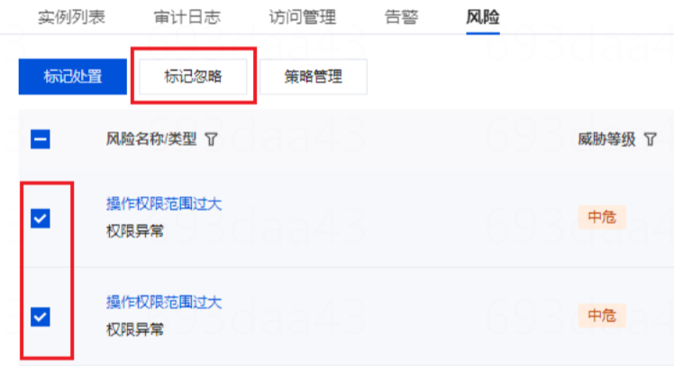 批量处理:选择多个风险名称为操作权限范围过大的风险,单击标记忽略。