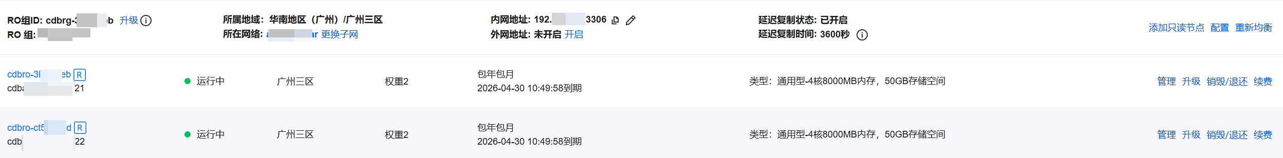 3. 在只读实例列表找到目标 RO 组,在其 RO 组 ID 后单击升级。