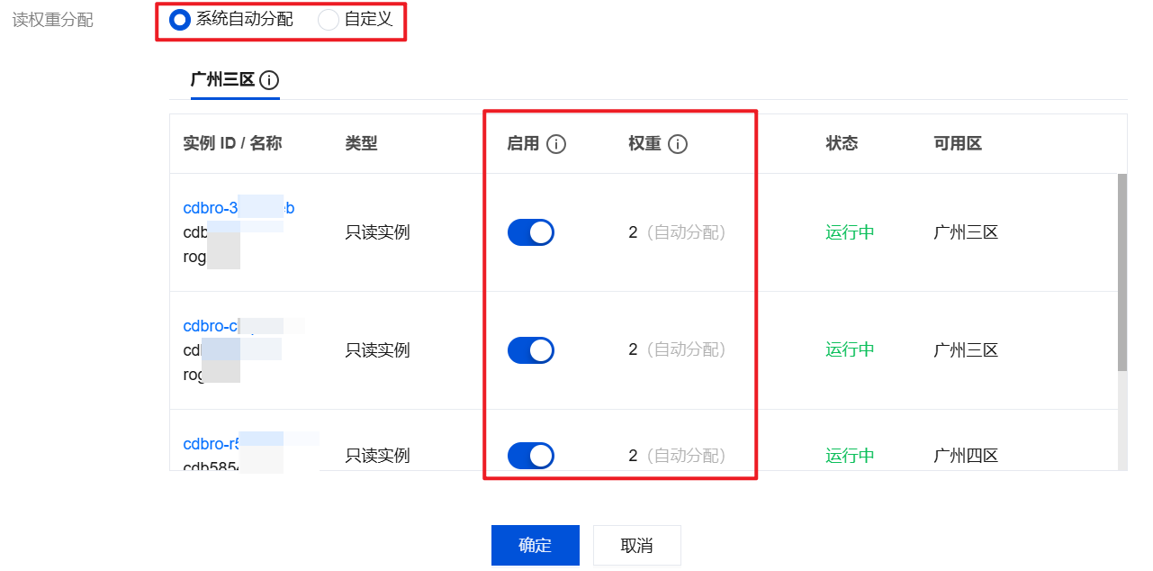 4. 在读权重分配下,设置分配方式、启用需要的只读实例,单击确定。配置页面的其他设置请参见 查看和修改访问策略。