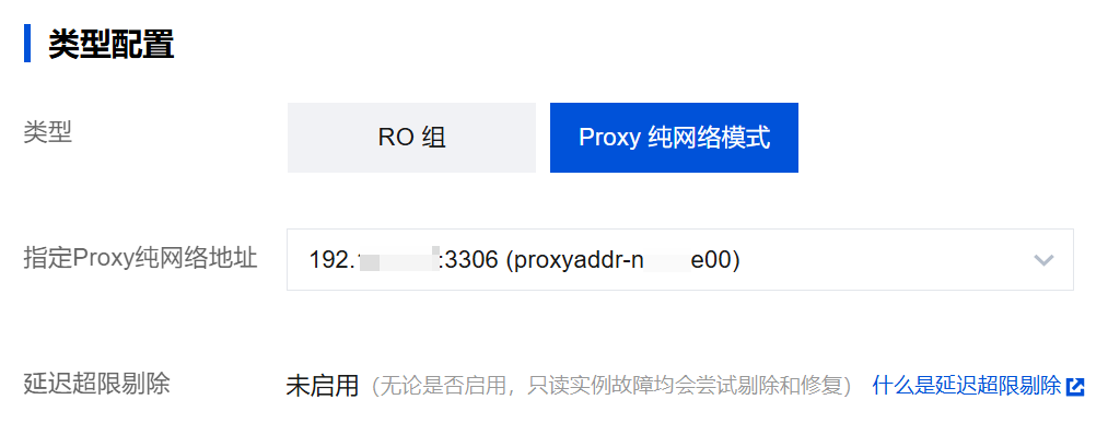 方式二:可以在 Proxy 纯网络模式 的 RO 组的配置页面进行设置,操作方法请参考 配置只读实例 RO 组。