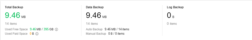 Total Backup: This section displays the size and quantity of all, data, and log backups as well as the free tier occupied by all the backups.