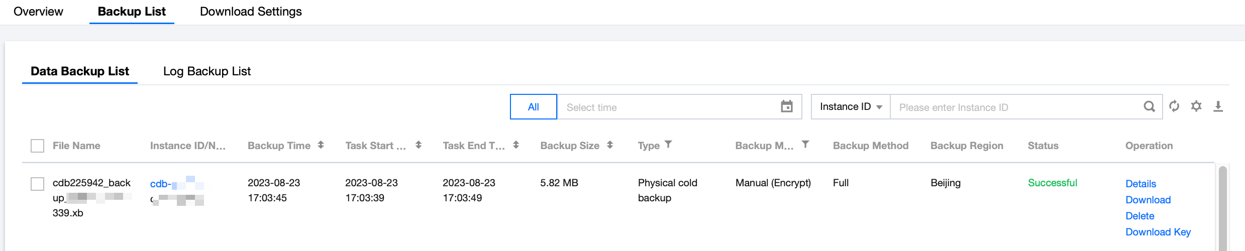3. Select the Backup List tab at the top. The backup list is divided into data backup list and log backup list. Clicking on an instance name in the list will take you to the instance details page. The backup list supports filtering by time range and fuzzy search by instance name and instance ID.
