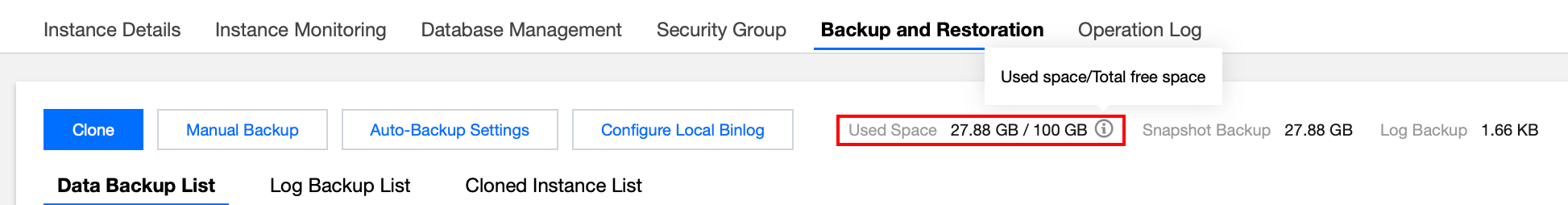 2. On the instance management page, select Backup and Restoration to view the used backup space and free space of the instance.