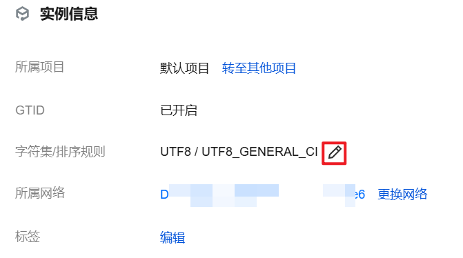 2. 在实例信息里找到字符集/排序规则,单击修改图标。