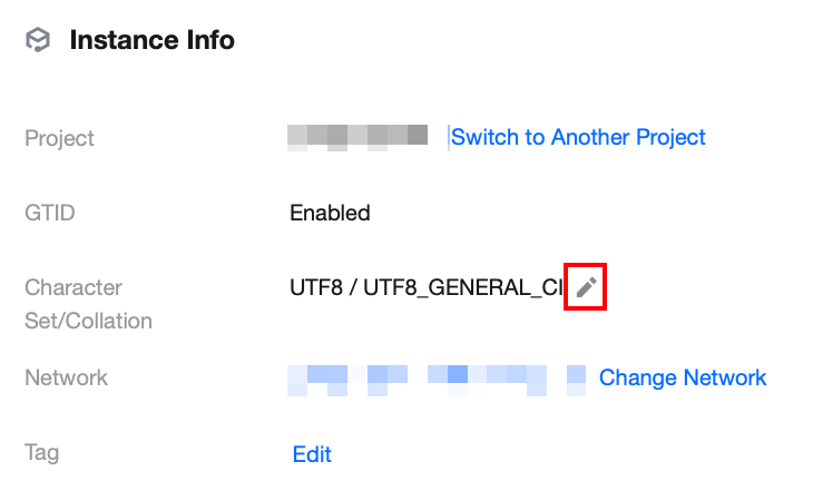 2. Find the character set in Basic Info and click the modification icon to modify it.
