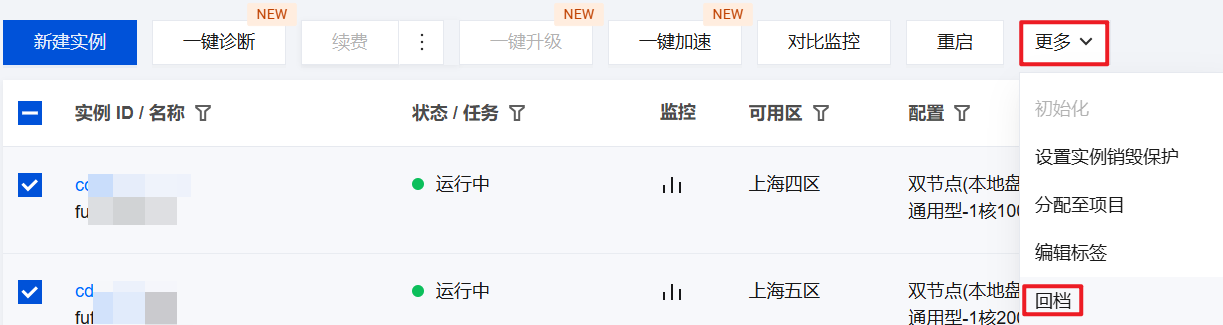 若只需进行一个实例的回档,也可进入实例管理页,在右上角单击更多 > 回档。