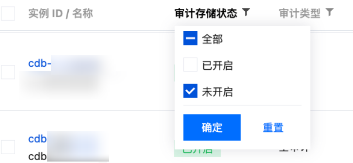 3. 在上方选择地域后,在审计实例页,单击审计存储状态选择已开启选项过滤已开启审计的实例。