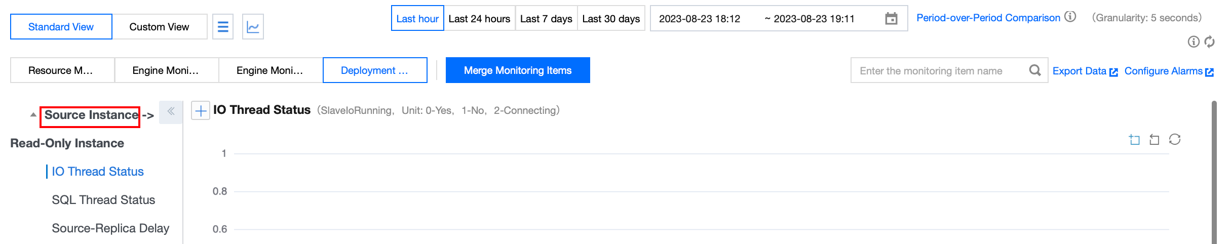 If the instance is a read-only instance, the object of instance deployment monitoring is the linkage between the source instance and the read-only instance. Deployment monitoring displays the IO and SQL thread status of the read-only instance. The source-replica delay (in MB or in seconds) refers to the delay between the read-only instance and the source instance.