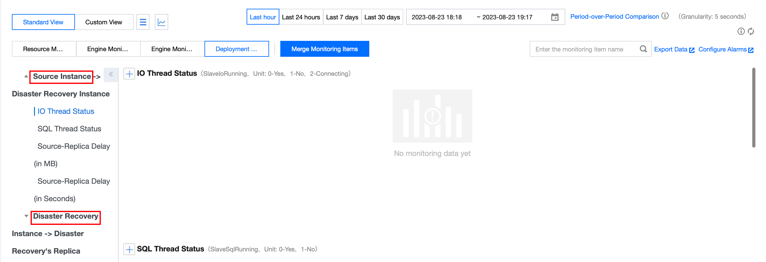 a. The object of instance deployment monitoring (source) is the linkage between the disaster recovery instance and the source instance. Deployment monitoring displays the IO and SQL thread status of the disaster recovery instance. The source-replica delay (in MB or in seconds) refers to the delay between the disaster recovery instance and the source instance.