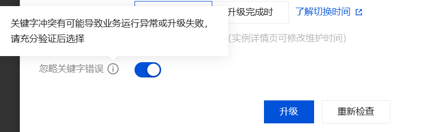 若检查结果涉及关键字冲突,则需要打开忽略关键字错误按钮后才能升级,由于关键字冲突有可能导致业务运行异常或升级失败,因此,请您对 MySQL 8.0版本的实例进行充分验证并符合业务需求后,再选择将目标 MySQL 5.7版本的实例进行升级。