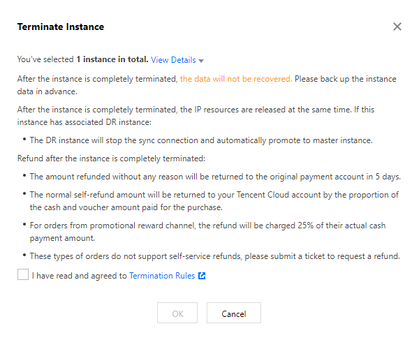 When you no longer need an instance, you can isolate it, rendering it unusable (but not terminated or deleted). Once isolated, the instance becomes inaccessible and is placed in the recycle bin. You can restore the instance from the recycle bin or permanently terminate it. After isolation, the resource space is not released, and the basic replica of the data is retained. Upon isolation expiration, the instance is permanently terminated.