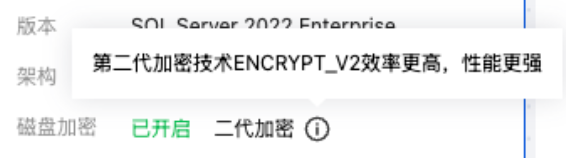 若显示磁盘加密字段,加密状态为已开启,则表示该实例已开启磁盘加密功能,采用第二代加密技术 ENCRYPT_V2,效率更高,性能更强。