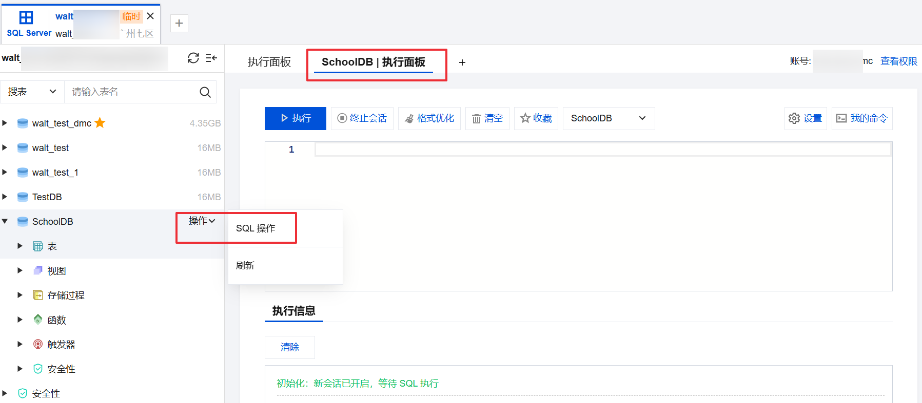 鼠标悬停至数据库名称处,选择操作 > SQL 操作,进入该数据库对应的执行面板。