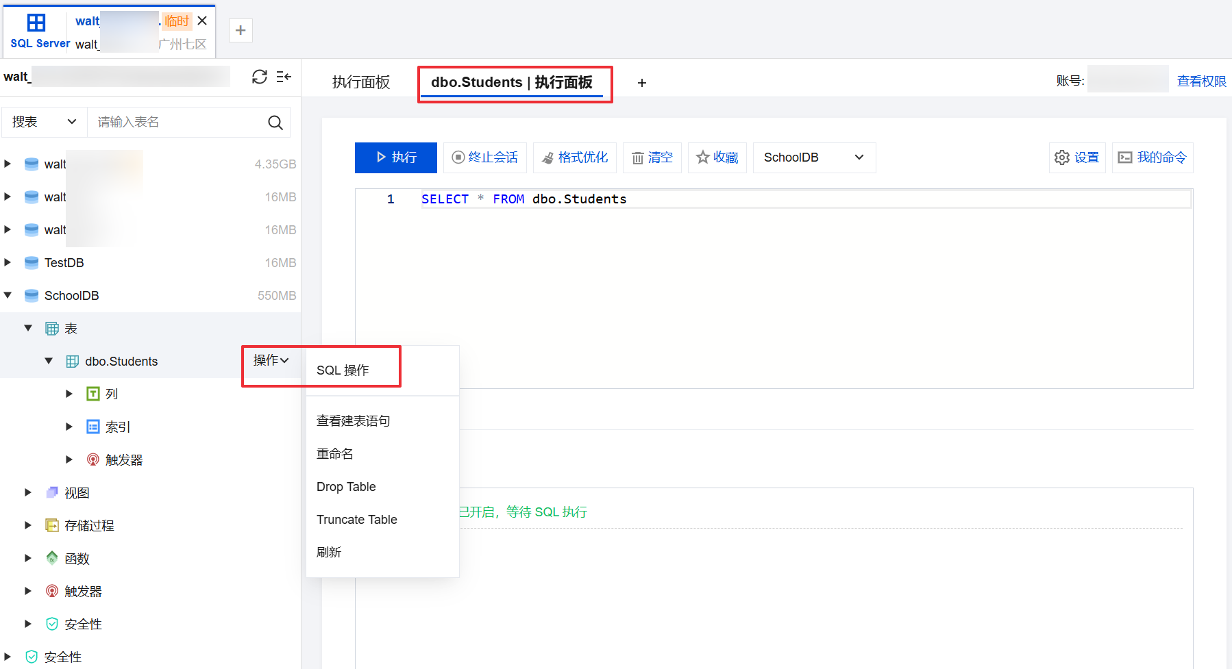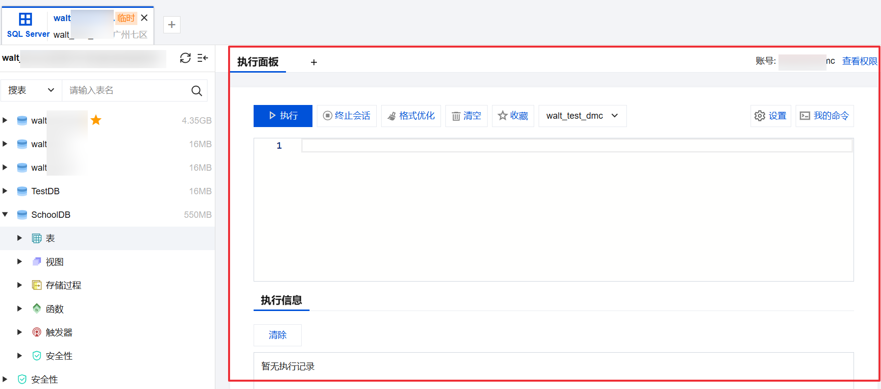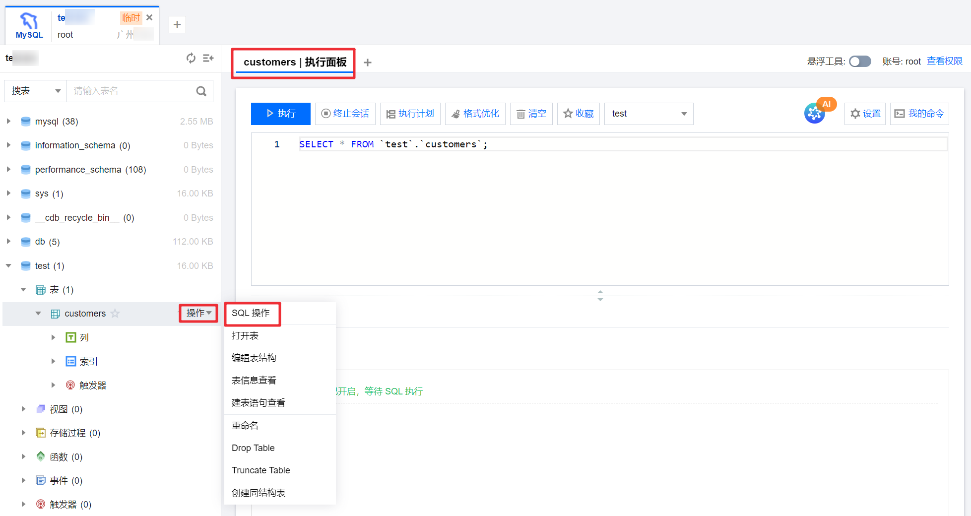 SQL 操作(SQL 执行面板)为用户提供界面化 SQL 编译器,预置常用 SQL 模板,并支持用户自定义执行 SQL 语句,方便用户通过界面查询和管理数据库数据。