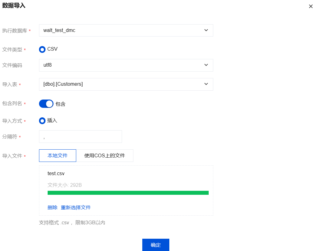 导入文件 | 本地文件:单击点击上传上传本地文件或拖拽文件至对应区域。仅允许上传3GB以内且格式为 .csv 的文件。 使用 COS 上的文件:请输入 COS 源文件地址。请提供公有读权限的 cos 地址,以便于 DMC 服务能获取到该文件。 |