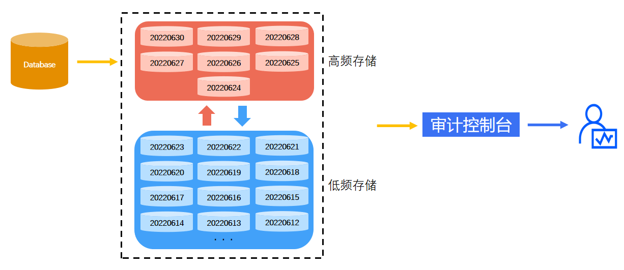 如图所示,若设置最近7天的数据存储在高频存储中,则超过最近7天的数据会自动落冷至低频存储中,延长高频存储时长后,符合保存时长的审计数据会自动从低频存储迁移至高频存储中。